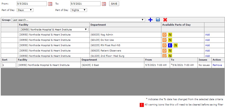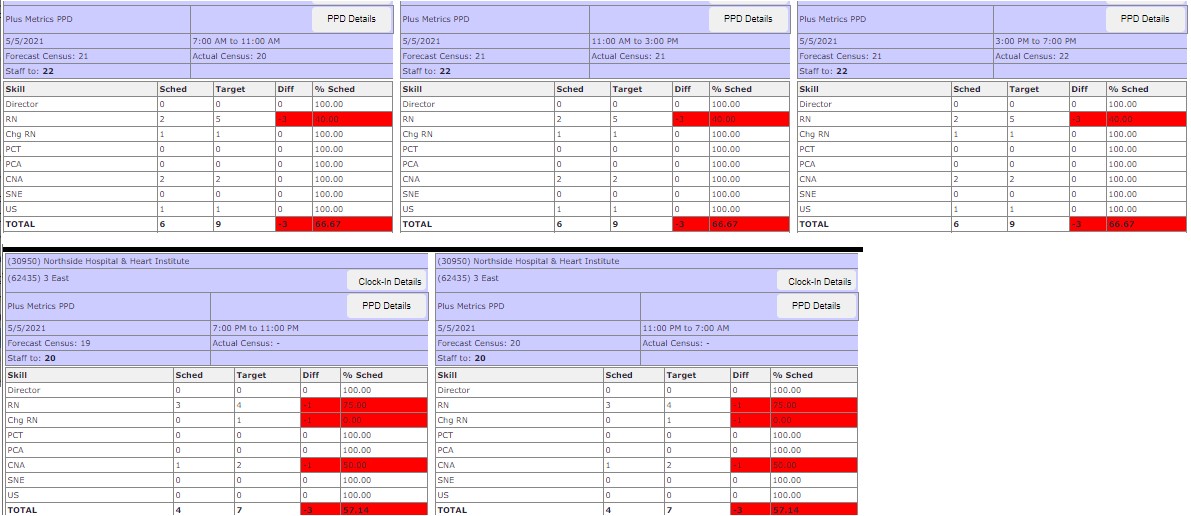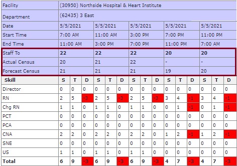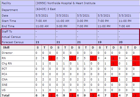 The Daily Roster page opens, showing the departments you selected as filter criteria as well as the census, scheduled staff numbers, and information regarding staff scheduled for Productive and Other Productive shifts.