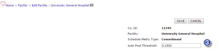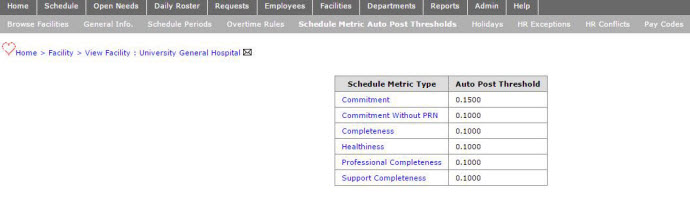 - The Schedule Metric Auto Post Thresholds page opens, with a default Auto Post Threshold of 0.1000 for each Schedule Metric Type: Commitment, Commitment Without PRN, Completeness, Healthiness,