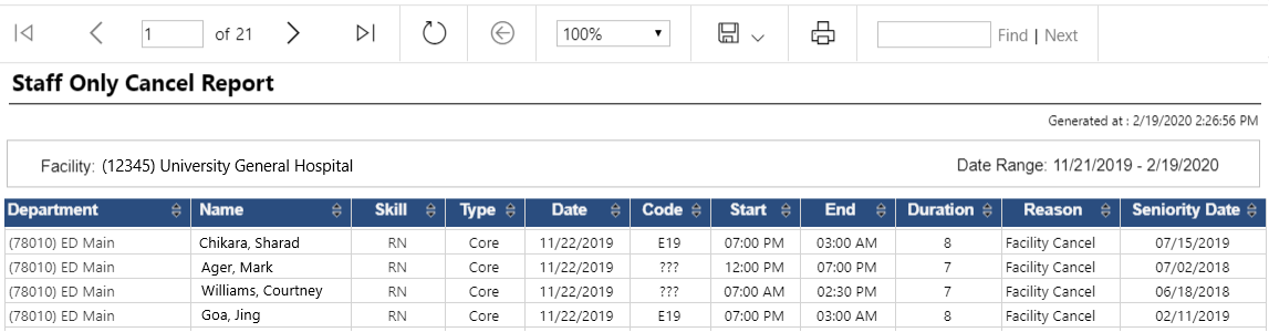 The Staff Only Cancel Report simplifies and standardizes reporting of cancelled shift information. If staff reports are activated for your facility and configured