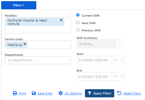 Filter options are determined by the user’s assigned access and permissions. Only those facilities, service lines, and/or departments to which the user has access are available for selection.